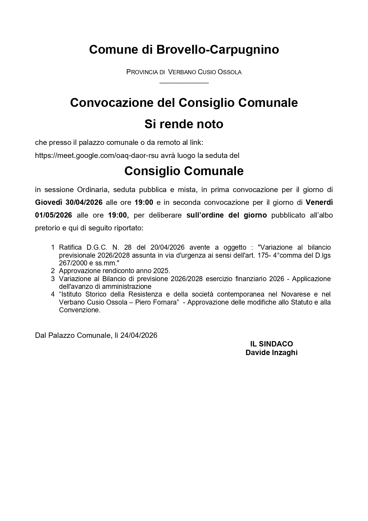 Convocazione Consiglio Comunale per il giorno giovedì 30/04/2026 alle ore 19:00